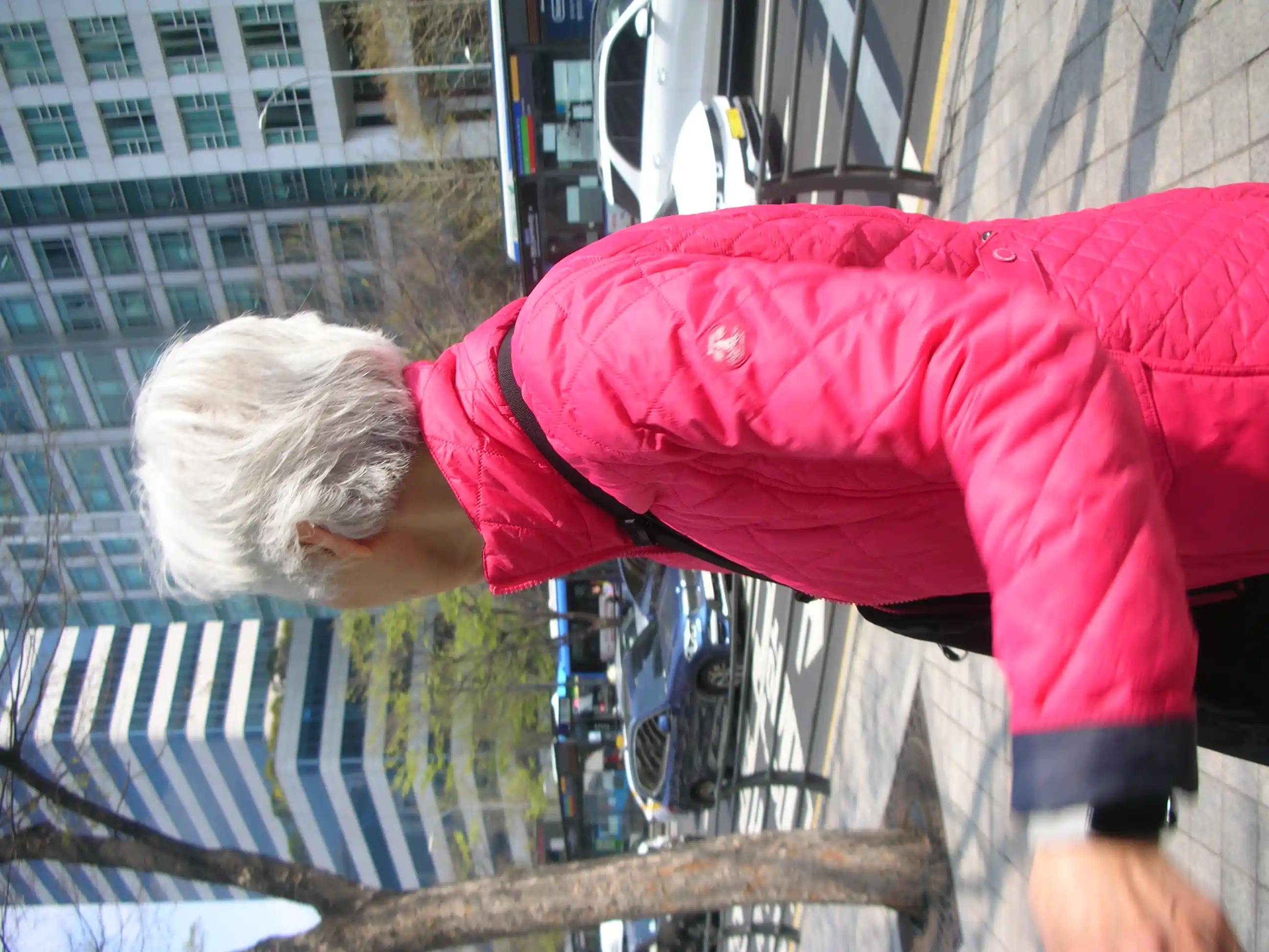 Ich mag die grelle Farbe, steht dir, sage ich. Damit die alten Leute nicht überfahren werden , sagt sie. Recht hat sie!