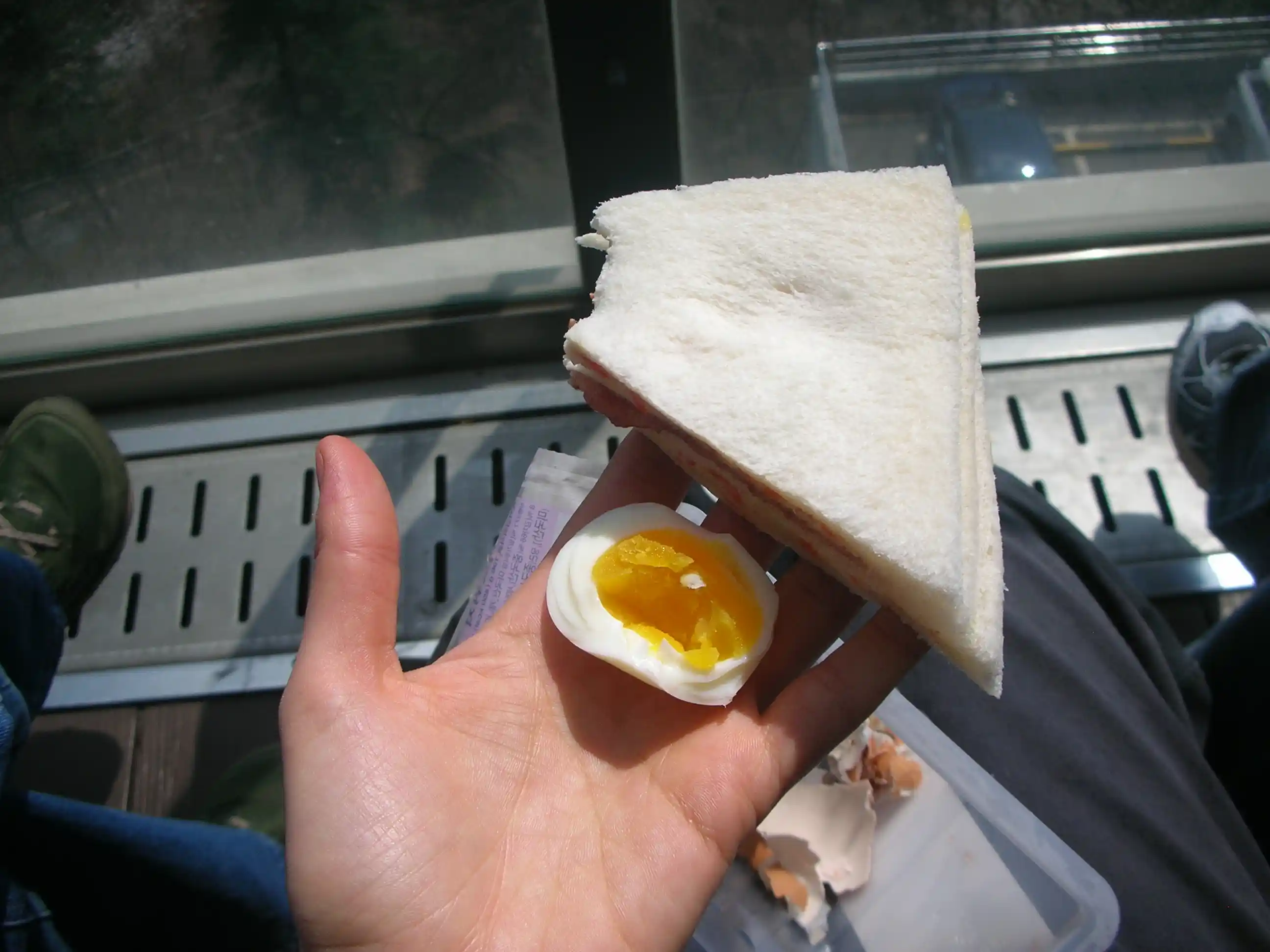 Auf dem Turm gabs noch einen kleinen zwischendurch-Snack. Neben zig Restaurants gabs auch einen 7 eleven. Wir haben uns die gekochten Eier, ein Sandwich und eine Financier-Kuchen-Stange vorgenommen. Die Eier waren wunderschön Orange in der Mitte und sehr lecker. In Deutschland würde ich lieber aus dem Fenster springen als ein gekochtes Ei aus einer Verpackung zu essen, aber hier geht das.