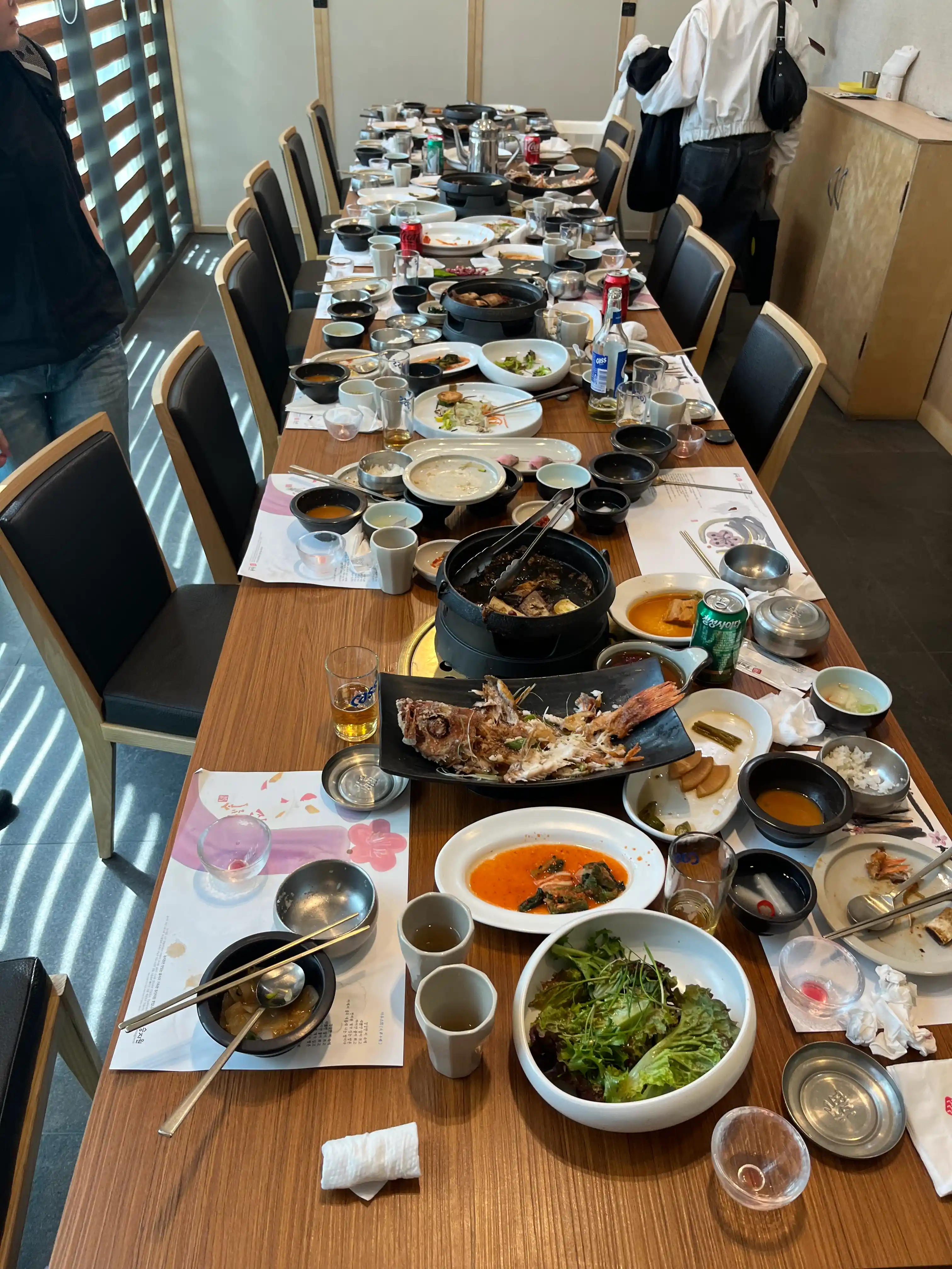 Es gab u n g l a u b l i c h viel Essen. Generell, sind wir hier ein wenig überfordert wieviel Essen man im Restaurant bekommt (ist natürlich auch ganz toll) und nehmen immer die Reste mit Heim. Als der erste Gang losging hab ich mich schon gefragt wie wir das alles schaffen sollen, dann kam der Zweite, dann kam der Dritte und dann noch Reis und Suppe am Ende. Es gibt viel Fleisch, ich probiere von allem ein bisschen aber das Rinder-Tartar, dass man sich mit eingelegtem Rettisch in Gim einwickelt war mir leider zu roh.