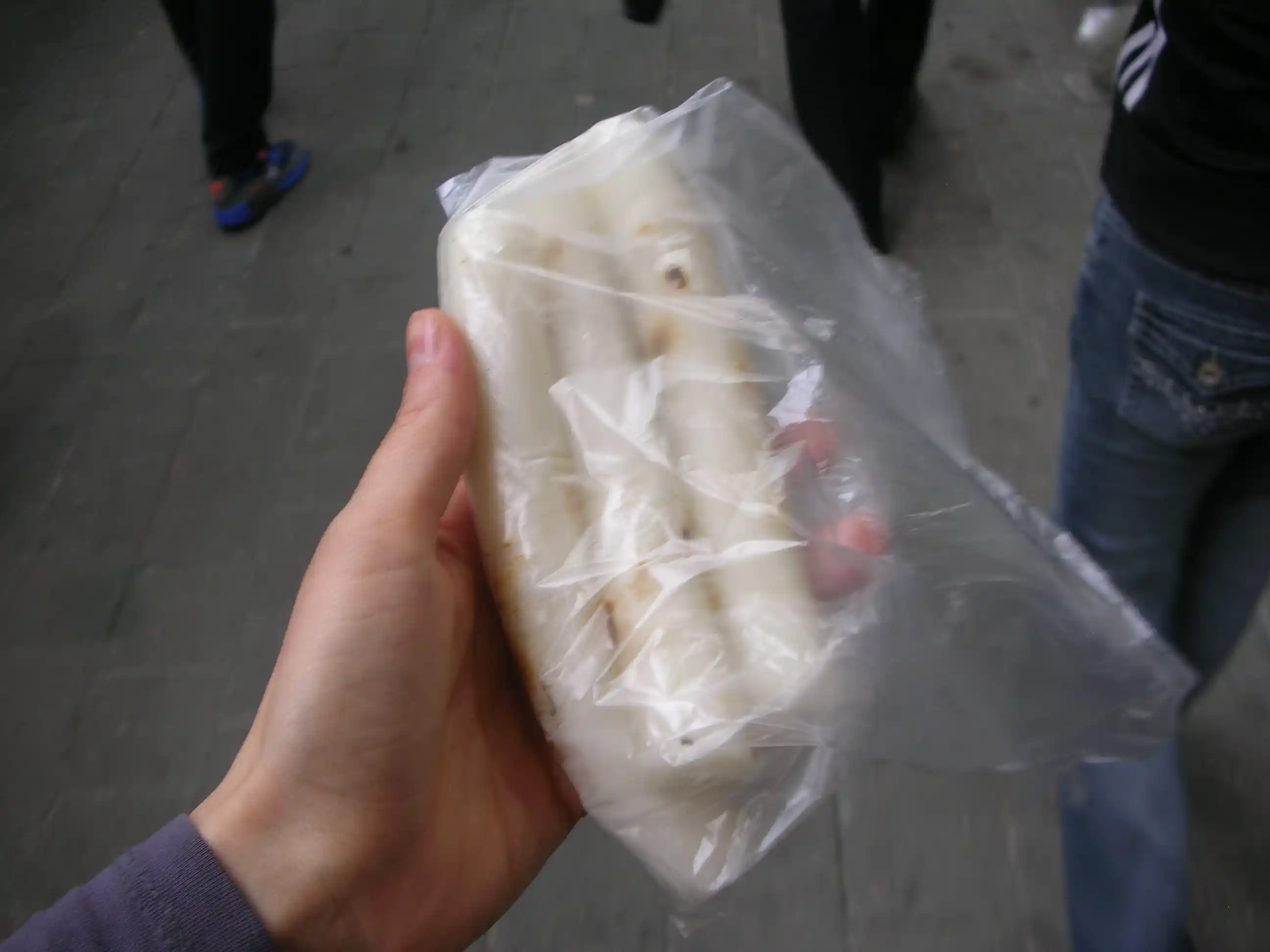 Für den Weg habe ich gegrillte Reiskuchen von einer am Boden sitzenden alten Dame gekauft. Sievor einem kleinen Grill der mit Pappkartons ummantel war.